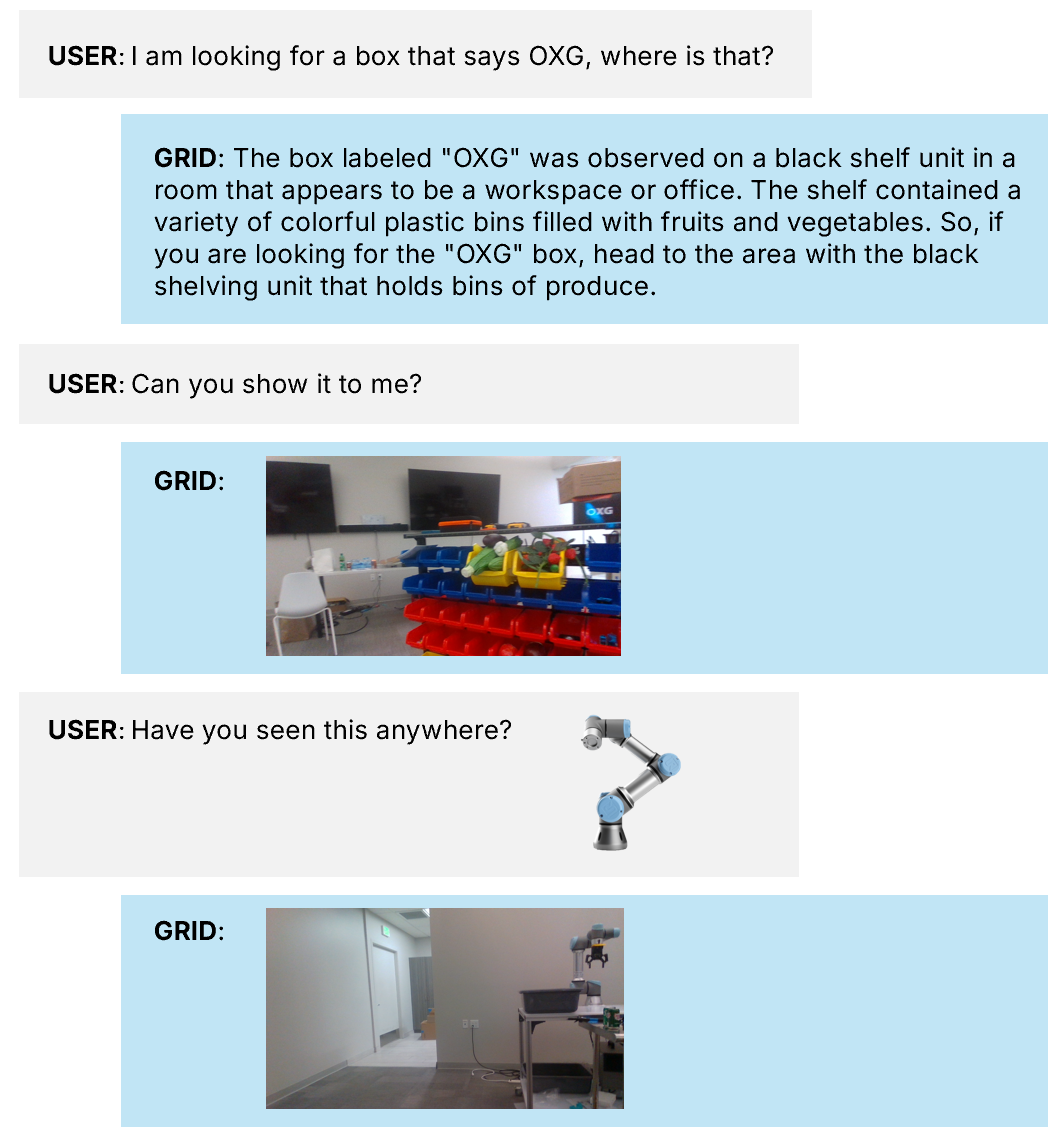 - Observational memory records the world in an agent-friendly way as semantic snapshots through textual captions, object-centric image embeddings, and more. Our robots can answer questions with grounded evidence, receive images as input and identify similar locations or objects, or just converse casually about a space.