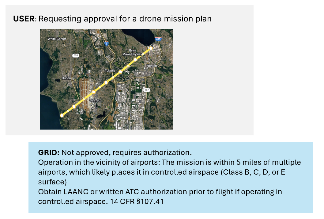 - Domain memory encodes external knowledge such as environmental or task specific guidelines. We show an example where our agent was able to parse the FAA Part 107 guidelines provided to it, and then classify drone missions as valid or invalid with cited justification.
