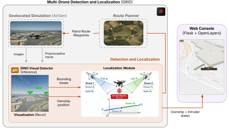Observing the system in action: patrols dispersing across the airspace, detections triggering in real time, localization estimates converging on the intruder; turned debugging into iterative refinement rather than blind troubleshooting. That observability, combined with how readily the pieces composed, is what made this project tractable. GRID provided simulation, state-of-the-art detection, and asynchronous multi-agent control as modular building blocks rather than separate systems to integrate and maintain. The result was more time spent on patrol geometry and localization logic, less on infrastructure. For counter-UAS, where failures emerge from interactions between components rather than any single subsystem, that composability is essential.